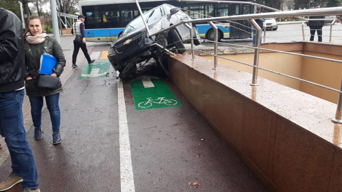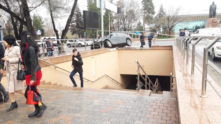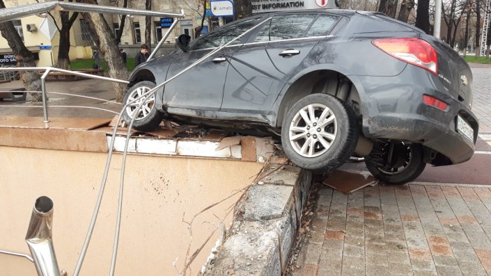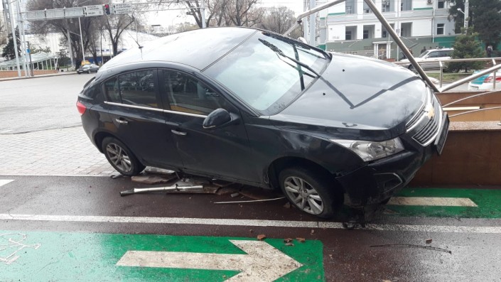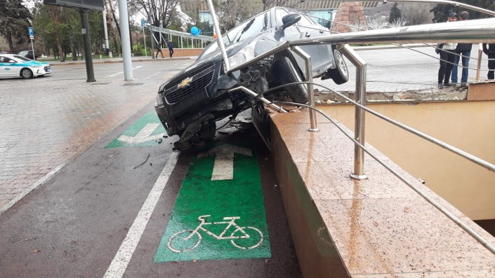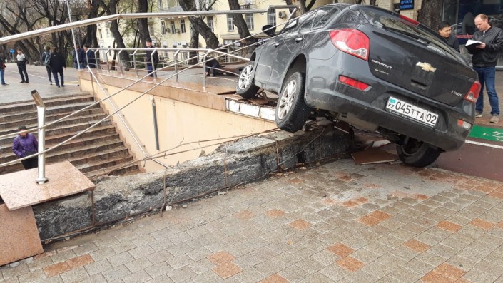Водитель Chevrolet Cruze не справился с управлением и влетел на подземный пешеходный переход в центре Алматы, передает корреспондент программы "Территория происшествий" на телеканале СТВ.