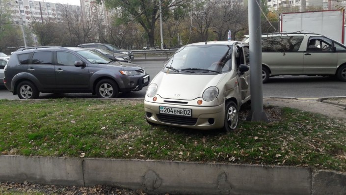 Daewoo Matiz спровоцировал аварию и врезался в столб в Алматы, передает корреспондент программы "Территория происшествий" на телеканале СТВ.