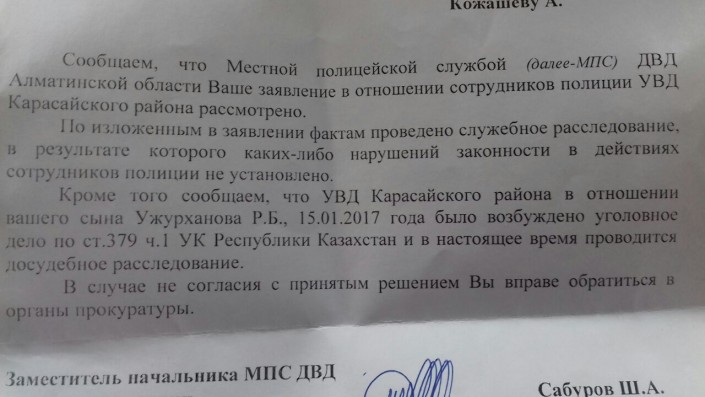"Местной полицейской службой Ваше заявление в отношении сотрудников полиции УВД Карасайского района рассмотрено. По изложенным фактам проведено служебное расследование, в результате которого каких-либо нарушений законности в действиях сотрудников полиции не установлено. Кроме того сообщаем, что УВД Карасайского района в отношении вашего сына было возбуждено уголовное дело по статье 379 УК РК. В случае несогласия с принятым решением Вы вправе обратиться в органы прокуратуры", - говорится в повестке.