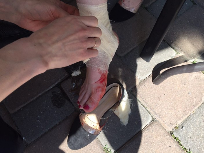 "Это случилось в среду, 17 августа, в 13.30. Сидели за этим самым столиком, нас было четверо. Я получила травму, мне осколок прямо в ногу попал, также в руку, есть ушиб головы, но не очень, только краем. Ходить не могу, хромаю. Глаза не пострадали, потому что были очки. Подружка-коллега сидела, она вот очень пострадала, очень серьезные травмы у нее. Пишут, что не особой тяжести, на самом деле все очень критично, она в больнице. У нее сотрясение, какой-то сосуд повредился. Она прислала мне фотографии, где ей уже зашили голову. Там огромнейшая рана, чуть ли не до костей, до головного мозга. Врачи отправили ее на МРТ. При этом подругу не стали класть в бесплатное отделение, сказали что бесплатно лечат только по квоте. Сначала отправили ее домой, зашив рану", - сообщила пострадавшая.