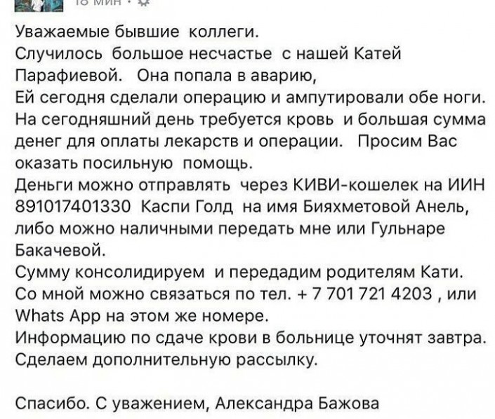 Между тем, как стало известно Tengrinews.kz, одной из пострадавших в больнице ампутировали обе ноги. Друзья и коллеги обратились к пользователям соцсетей с просьбой помочь девушке. "Требуется кровь и большая сумма денег для оплаты лекарств и операции", - говорится в обращении.