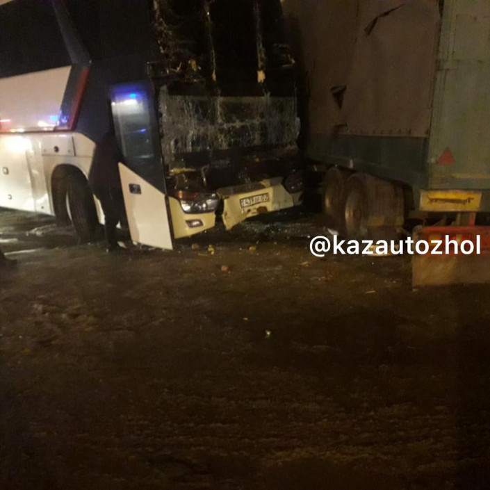 Тем временем два пассажирских автобуса друг за другом направлялись из Тараза в Алматы. Водитель первого автобуса, заметив ДТП, начал тормозить и врезался в боковую часть КамАЗа. Второй же автобус, не соблюдая дистанцию, въехал в первый автобус.