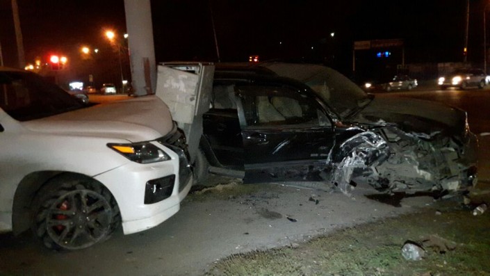Авария произошла на пересечении улиц Толе би и Яссауи. По словам очевидцев, Toyota 4Runner двигалась по Толе би в восточном направлении в крайнем левом ряду, и водитель хотел повернуть налево. В то же время Lexus поворачивал налево со второго ряда. Произошло столкновение, обе машины улетели на разделительный газон, попутно снеся светофор.