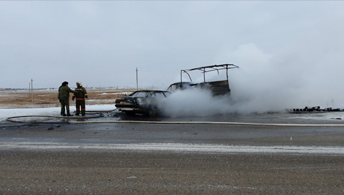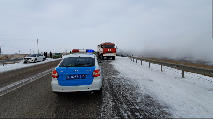 Две машины сгорели после ДТП на трассе в Павлодарской области