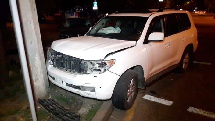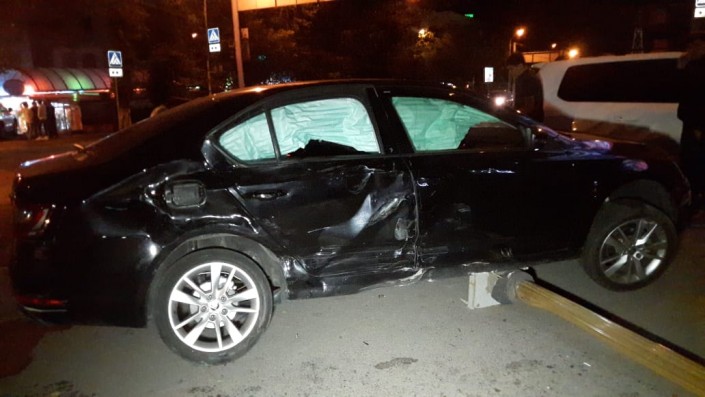 ДТП произошло на перекрестке улиц Манаса и Жандосова. Оба водителя утверждают, что они ехали на зеленый сигнал светофора. Toyota Land Cruiser двигался по Жандосова в восточном направлении, а Skoda ехала в южном направлении по Манаса. В результате столкновения Land Cruiser откинуло в бетонный столб, а автомашина Skoda снесла светофор.