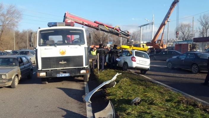 В Алматы груженый "КамАЗ" столкнулся с Lada и опрокинулся, передает корреспондент программы "Территория происшествий" телеканала СТВ.