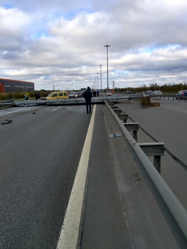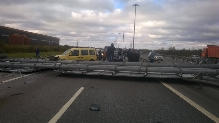 ДТП произошло 8 октября на внутреннем кольце кольцевой автомобильной дороги (КАД) между развязками с проспектами Культуры и Энгельса. "Упала рамная металлическая опора с установленными на ней дорожными информационно-указательными знаками над проезжей частью КАД", - рассказал начальник территориального ситуационного центра дирекции Илья Пузыревский.