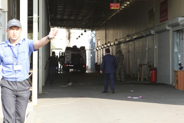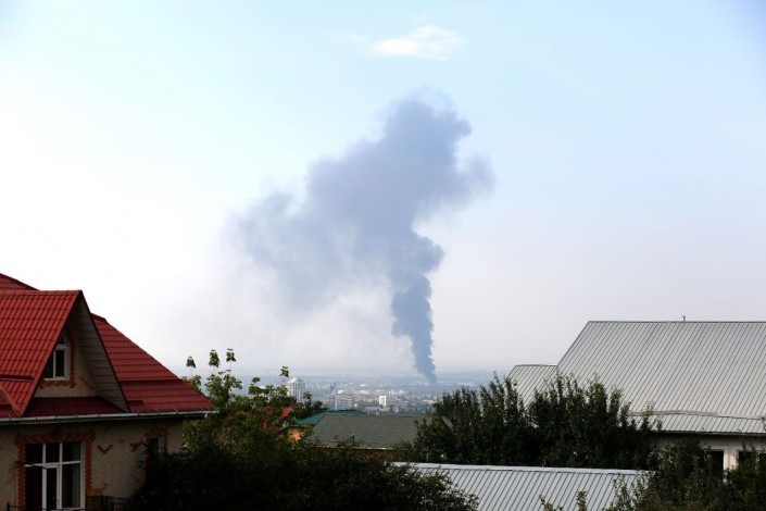 По информации корреспондента, предположительно, горят склады с обувью. Местные торговцы спешно выносят товар из уцелевших складов. На место также прибыли солдаты Нацгвардии.