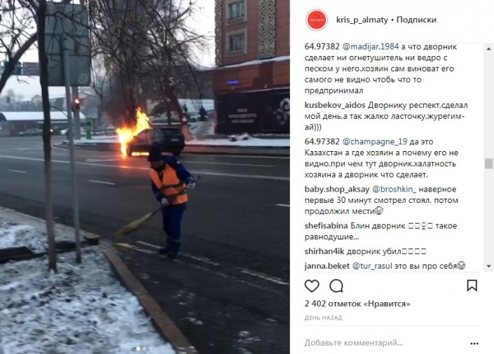 "Давно так не смеялась. Этот дворник сделал мой день. Всего лишь горит машина, ну да, обычное дело, каждый день видит, наверное. Конец света будет, он невозмутимо будет чистить улицу)))", - написала Роза Есенкулова.