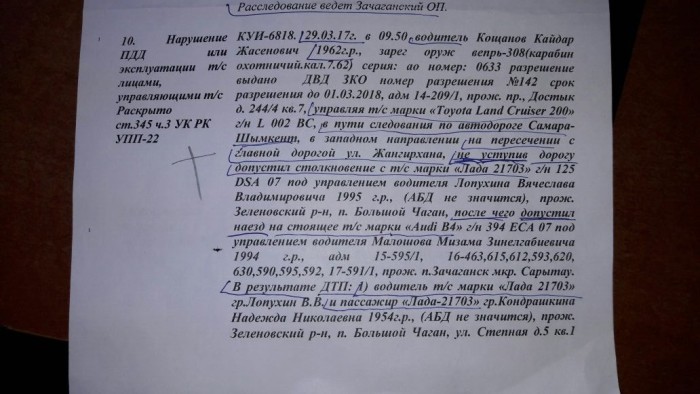 Напомним, ДТП, о котором идет речь, произошло утром 29 марта в Уральске на пересечении улицы Жангирхана и объездной дороги. Согласно полицейской сводке, депутат на Toyоta Land Cruiser 200 двигался по второстепенной дороге и не уступил дорогу автомобилю "Лада Приора" под управлением 22-летнего Вячеслава Лопухина, который двигался по главной дороге. В легковушке, кроме водителя, находилась его бабушка - 63-летняя Надежда Кондрашкина.