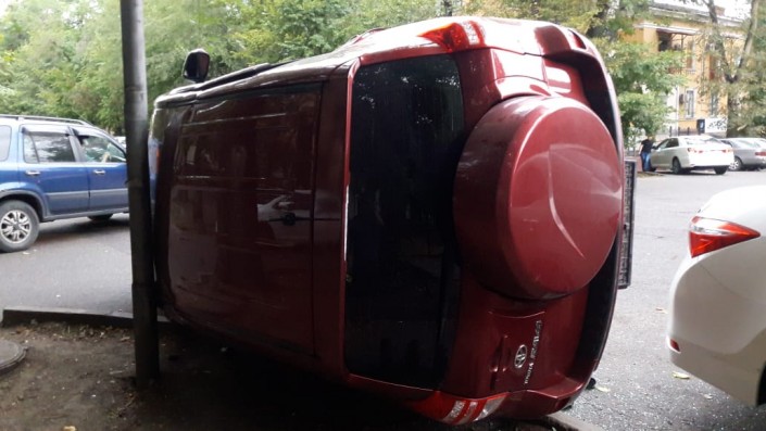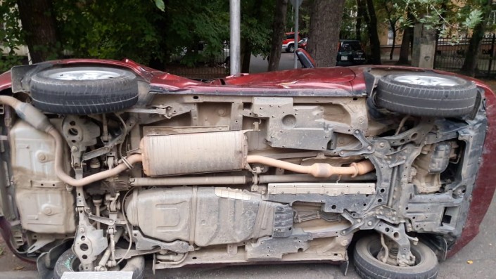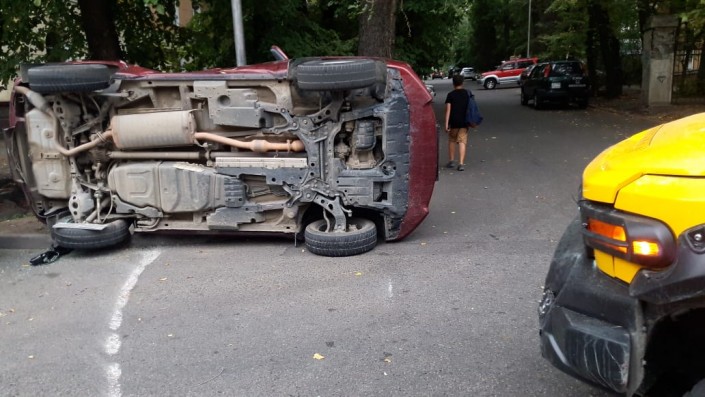 Кроссовер Toyota RAV4 перевернулся после столкновения с внедорожником Toyota FJ Cruiser в Алматы, сообщает корреспондент программы "Территория происшествий" на телеканале СТВ.
