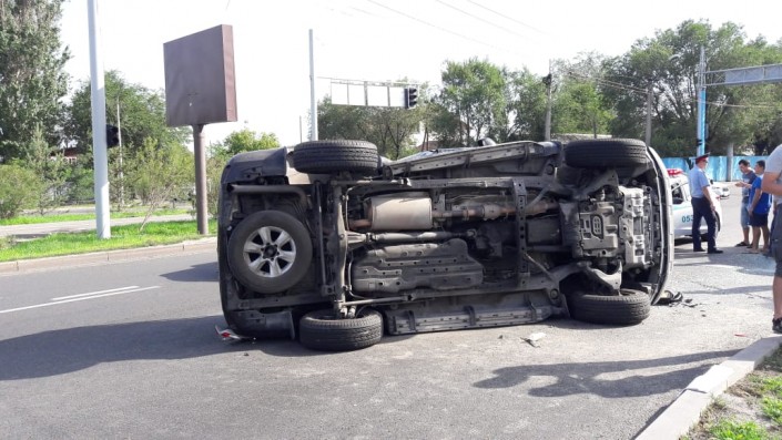 Land Cruiser лег на бок после ДТП на перекрестке в Алматы, сообщает корреспондент программы "Территория происшествий" на телеканале СТВ.