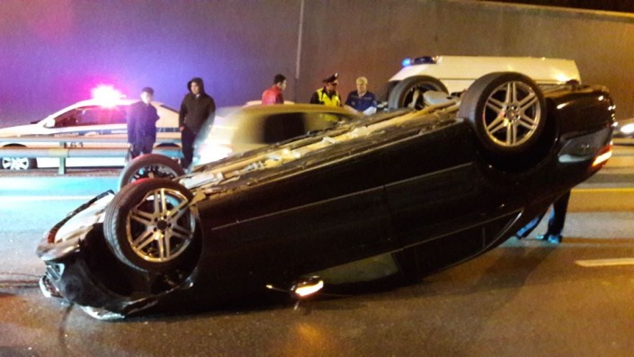 В туннеле столкнулись автомобили MG и Mercedes. По предварительной версии, Mercedes ударил MG в заднюю часть, после чего перевернулся на крышу. Водитель MG был госпитализирован с черепно-мозговой травмой. Другие подробности выясняются.
