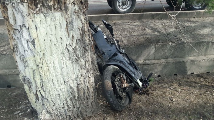 Мотоцикл ударил Toyota и влетел в дерево в Алматы, передает корреспондент программы "Территория происшествий" на телеканале СТВ.