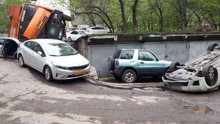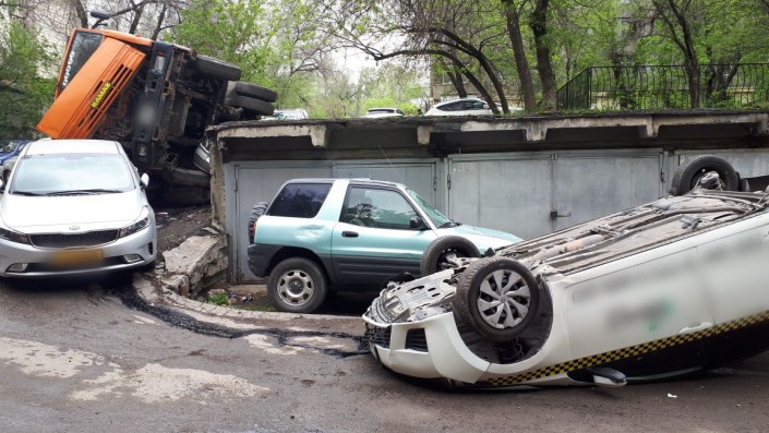 ДТП произошло во дворе по улице Сатпаева, между проспектами Достык и Назарбаева. Как рассказал водитель мусоровоза, он подъехал к мусорным контейнерам, однако не смог проехать из-за припаркованных автомобилей. Водитель поставил грузовик на ручник и вышел из салона, чтобы попросить владельцев убрать свои машины. Но их на месте не оказалось. В этот момент КамАЗ "сорвался" с ручника и врезался в Toyota Corolla. Она в свою очередь задела рядом припаркованный Rav-4 и перевернулась.