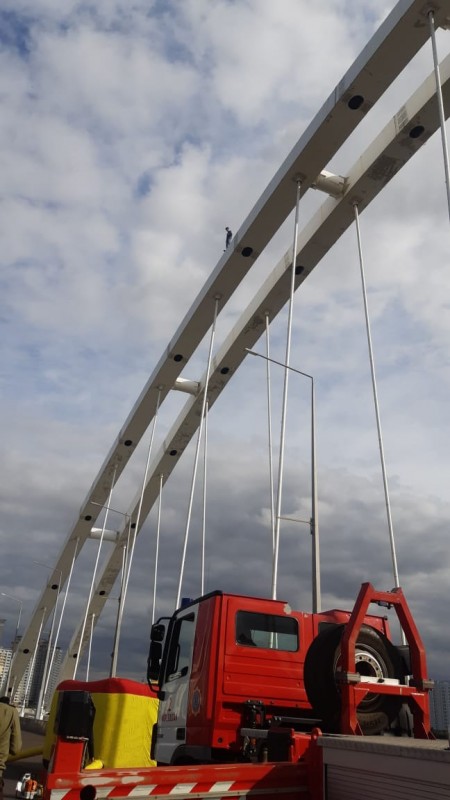 "В 15.35 наш сотрудник Центра оперативного управления заметил, что на мосту Сарайшык на металлическом дугообразном ограждении стоит мужчина. Незамедлительно туда была направлена экстренная служба спасения. Сейчас спасатели пытаются спустить мужчину", - сообщили в пресс-службе Департамента полиции Нур-Султана.