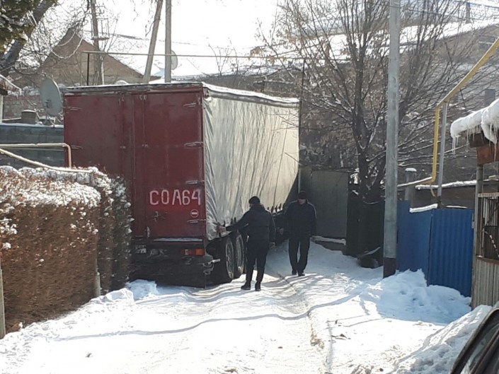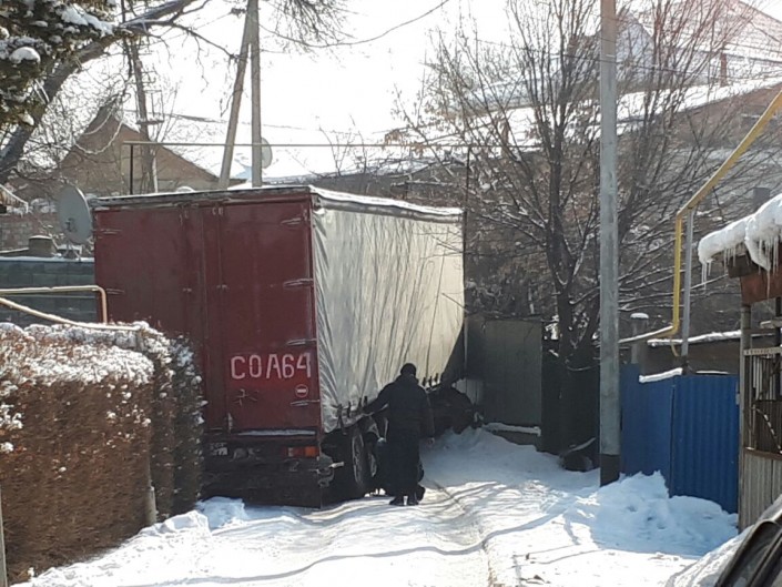 На узкой улице в Алматы застряла фура