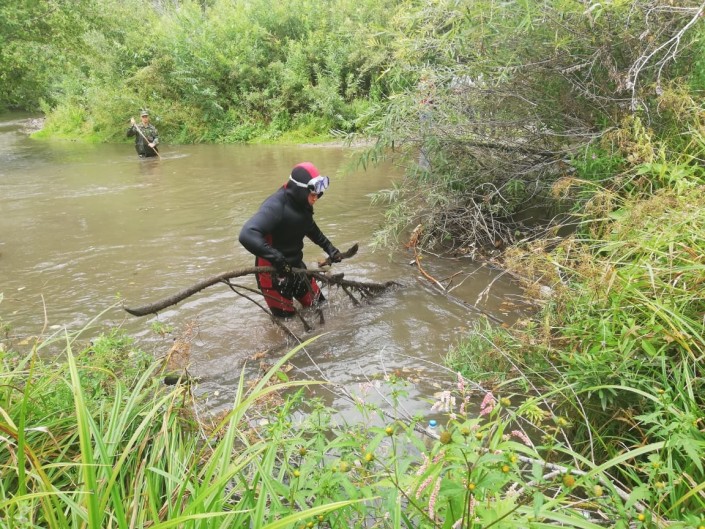 Другая группа волонтеров вместе со спасателями исследует берег реки, которая протекает неподалеку от дома Алихана.