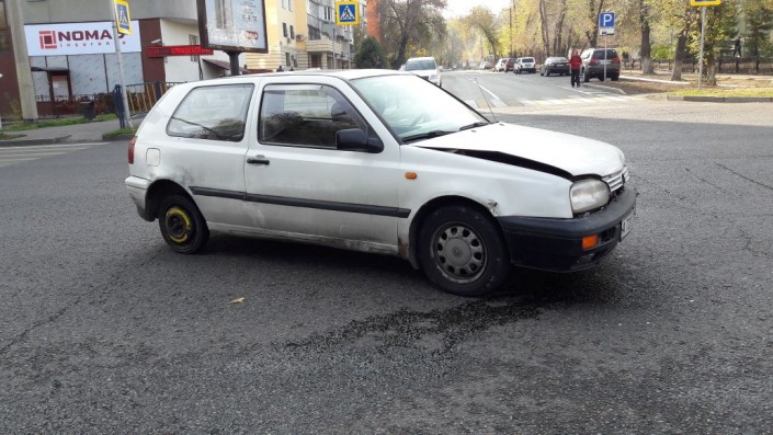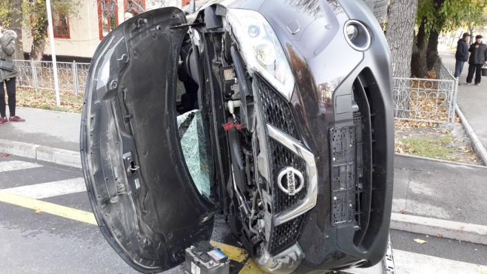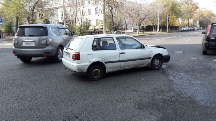 Как сообщает корреспондент, ДТП произошло на пересечении улиц Толе би и Абдуллиных. Nissan Qashqai следовал по Абдуллиных в северном направлении, а Volkswagen Golf  по Толе би в западном направлении. Qashqai проигнорировал знак "Уступи дорогу", проехал перекресток, Golf ударил его в бок. От удара Qashqai перевернулся, его откинуло на тротуар.