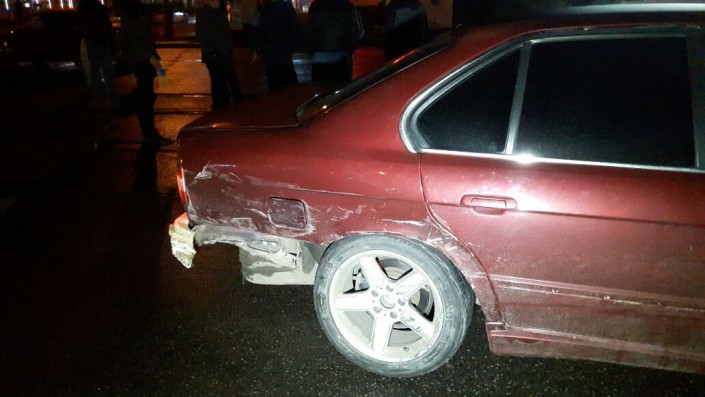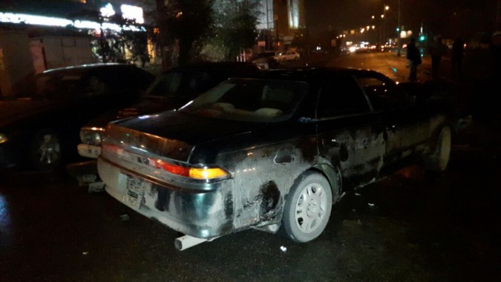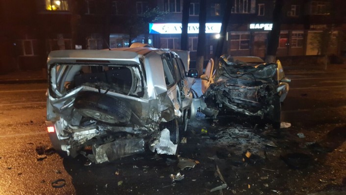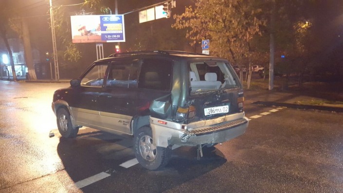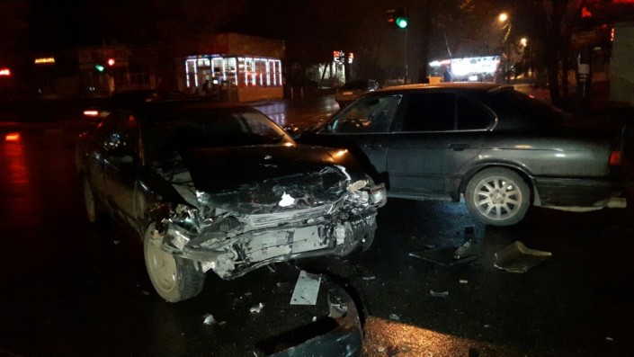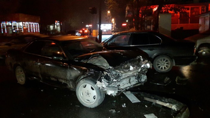 Первое ДТП произошло на пересечении улиц Толе би и Тургута Озала. По словам очевидцев, водитель Toyota Mark II проигнорировал красный сигнал светофора и столкнулся с двумя автомобилями марки BMW. В результате аварии пострадал водитель Toyota Mark II, его госпитализировали.