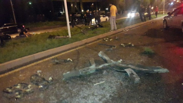 Авария произошла на Аль-Фараби за торговым центром Esentai Mall, перед улицей Шашкина (бывшая улица Университетская). Автомобиль марки BMW 745 двигался в восточном направлении. Водитель авто, не справившись с управлением, на большой скорости вылетел на газон и совершил наезд на препятствие.
