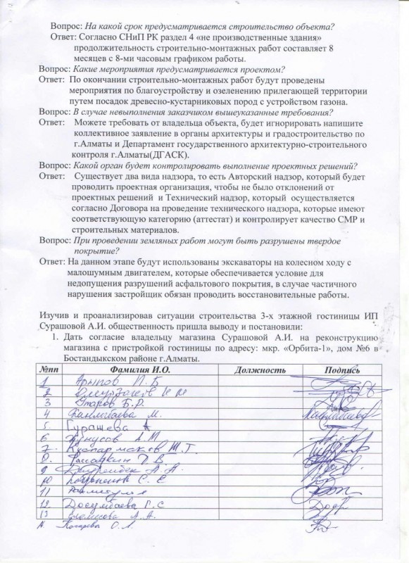 В июле там начали огораживать территорию, прилегающую к территории двора. "Естественно, мы подали заявления во все инстанции: районную прокуратуру, ГАСК, районный и городской акиматы, а также написали депутату. После проверки выявилось нарушение, что отсутствует согласие жильцов на строительство объекта. (...) Мы провели собрание жильцов и единогласно высказались против строительства", - рассказала собеседница.