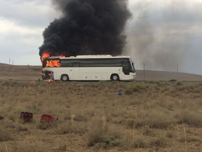 Пассажирский автобус сгорел на трассе Актау - Каражанбас в Мангистауской области, передает "Лада".