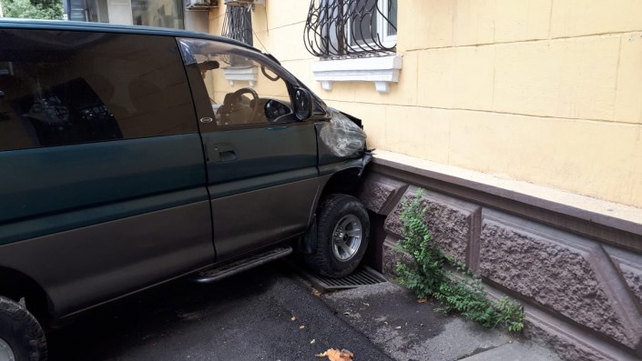 Перелетел через арык - Mitsubishi Delica врезался в дом в центре Алматы