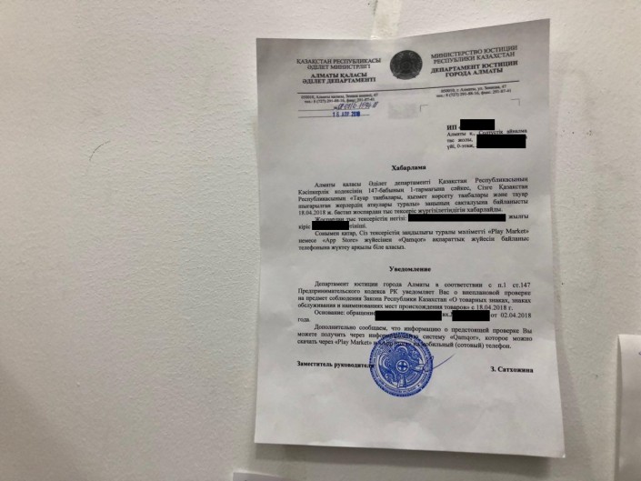 К индивидуальному предпринимателю Мерейгуль Жумахан проверяющие пришли впервые и о своем визите предупредили заранее. В ее бутике даже висит уведомление.