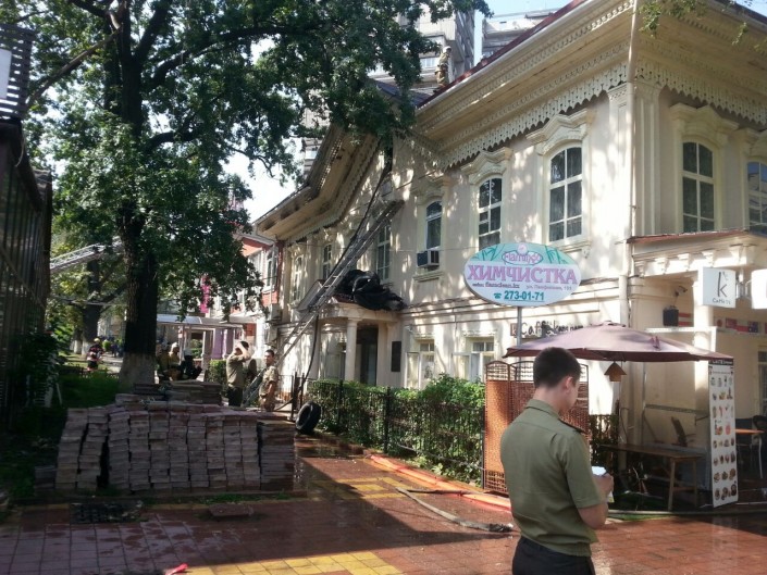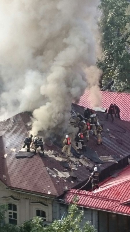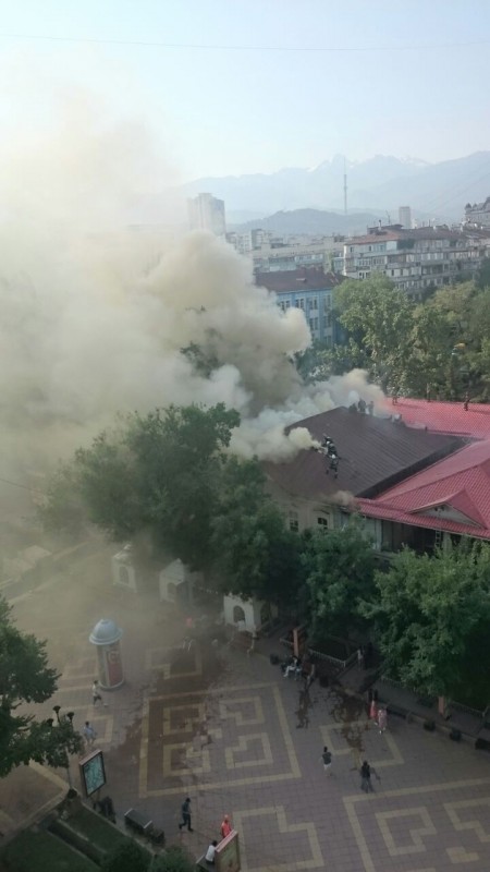 Сообщение от очевидца о горении кровли по адресу: улица Панфилова, 99 ОФ "Международный фонд Д.А.Кунаева" поступило на пульт "101" 07.49 утра. Известно, что здание 1860 года постройки. Первые пожарные подразделения прибыли к месту вызова уже через 4 минуты.