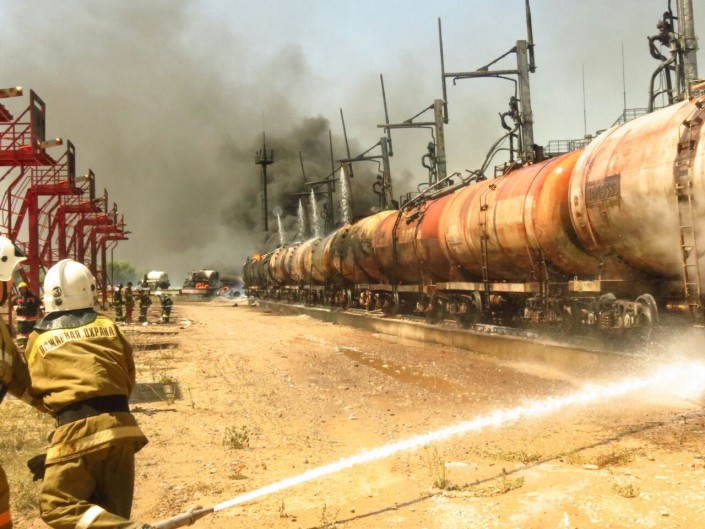 Возгорание произошло примерно в 10.50 в районе поселка Карабулак Сайрамского района ЮКО. Силами пожарных подразделений пожар на нефтебазе в ЮКО полностью ликвидирован в 17.07.