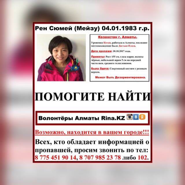 Как рассказали волонтеры, занимающиеся ее поисками, 34-летняя китаянка в день пропажи вышла из гостиницы в районе Центральной мечети и отправилась на встречу с подругой в торговый центр на пересечении проспекта Сейфуллина и улицы Макатаева. Выйдя оттуда, женщина отправилась на следующую встречу в торговый центр "Достык Плаза".