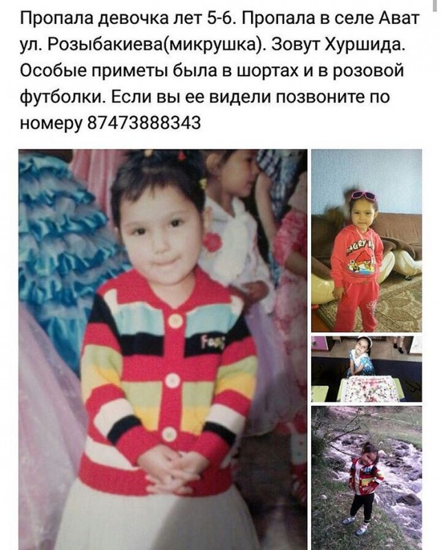 5-летняя Хуршидам Жапарова пропала 4 июня около 11.00 в поселке Ават Енбекшиказахского района. По словам соседки, тело девочки обнаружили местные жители и сотрудники полиции 6 июня в 01.00 в септике недалеко от дома. В настоящее время тело доставлено в морг, где будет проведены судебно-медицинская экспертиза относительно причин смерти и осмотр на предмет наличия каких-либо телесных повреждений.