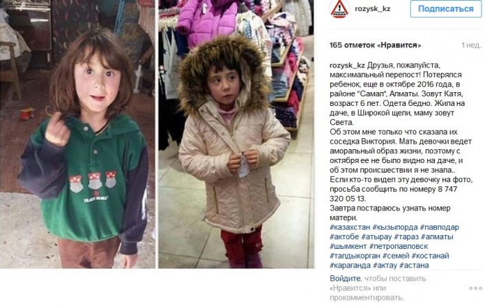 Сотрудники полиции заметили в Интернете пост, в котором граждан призывали найти девочку по имени Катя. "Как оказалось, сообщение в социальной сети опубликовала молодая алматинка по имени Наталья, являющаяся волонтером и занимающаяся благотворительностью. Под Новый год женщина с подарками направилась в семью Светланы, что проживает в дачном массиве Медеуского района. Ранее Наталья уже не раз помогала ей, а точнее маленькой дочери Светланы - шестилетней Кате. Потому что из-за своего пагубного пристрастия к алкоголю мать не оказывает должного внимания своему ребенку. Также, по словам волонтера, Светлана - многодетная мать, остальные ее дети якобы воспитываются в детском доме. Наталья поделилась, что, не найдя Свету с дочерью дома, она не на шутку встревожилась, женщина испугалась за девочку, которая с пьющей матерью могла попасть в беду. К тому же соседи ей рассказали, что мать и дочь они не видели с октября месяца. Вот так и появился пост в Сети", - рассказала официальный представитель ДВД города Алматы Салтанат Азирбек.