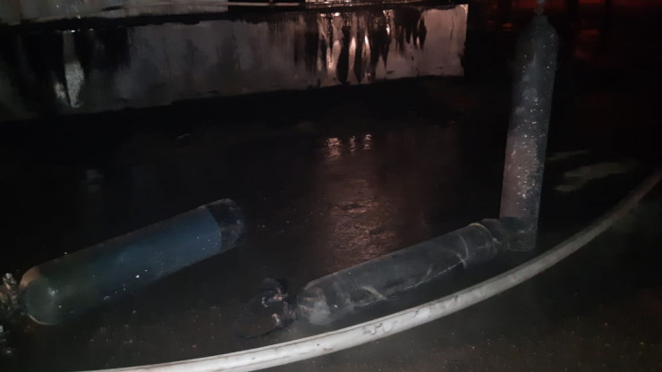 Из горящего склада пожарными эвакуированы три баллона с техническими газами объемом по 50 литров каждый.