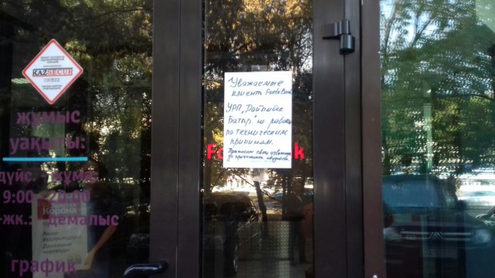 На двери отделения по адресу: проспект Райымбека, 100, висит объявление о том, что оно закрыто по техническим причинам.