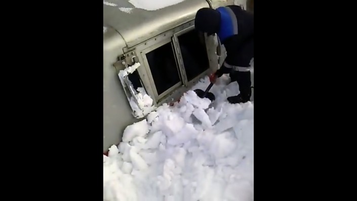 На железной дороге Алматы - Караганда тепловоз засыпало снегом почти по самую крышу. Очевидец запечатлел момент, когда рабочие прибыли освобождать поезд из снежного плена. Ролик опубликовал пользователь Серик Куатов на сайте YouTube.