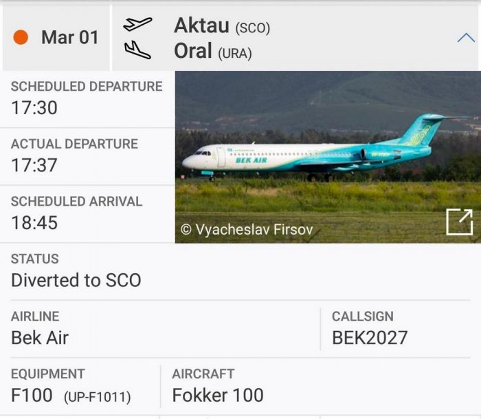 Как рассказали пассажиры рейса, инцидент произошел 1 марта. Согласно данным сервиса flightradar.com, самолет авиакомпании Bek Air, выполняющий рейс Z92021 Актау - Уральск, произвел взлет из аэропорта Актау в 17.37 и приземлился в аэропорту Актау в 18.17 местного времени.