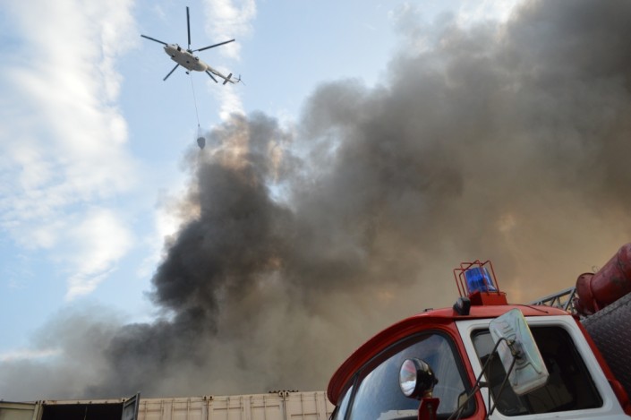 Отметим, что к тушению привлекли вертолет КА-32. На месте работают более 360 человек и 50 единиц техники. Вертолет уже сделал один заход и сбросил на пламя четыре тонны воды. Напомним, по предварительным данным, возгорание началось на рынке "Олжа".