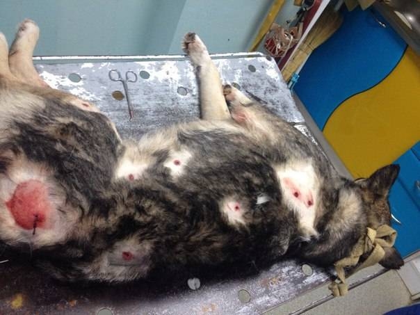 Прооперированную собаку защитники животных доставили в приют, где она находится в данный момент. Работники приюта даже придумали ей кличку - Веста. Животное пока лежит, но уже приподнимается на передних лапах. Из-за ранения горла есть еще не может, но пьет бульон.