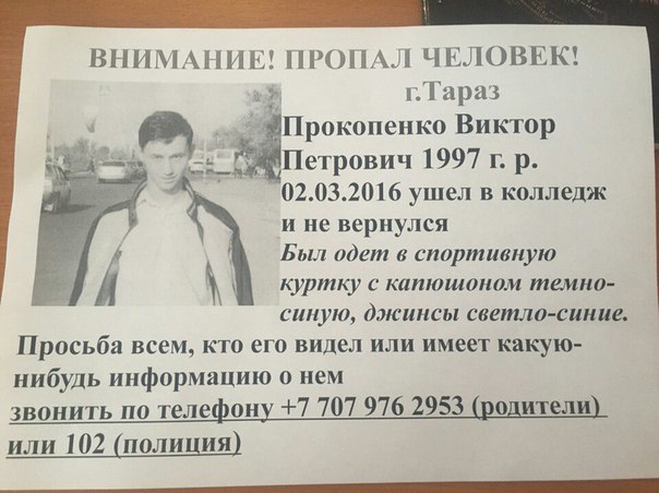 В Таразе вот уже неделю ведутся поиски студента третьего курса политехнического колледжа Виктора Прокопенко, 1997 года рождения. Объявления о розыске парня расклеены по городу, а также появились в социальных сетях.