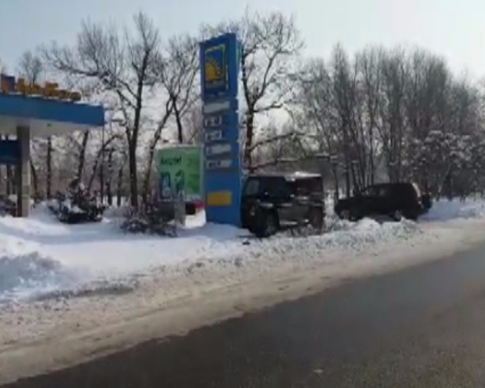 Mercedes-Benz во избежание столкновения резко повернул направо, залетел на бордюр, в арык и на полном ходу врезался в стенд автозаправки. В результате два человека были госпитализированы с различными травмами: водитель и ребенок.