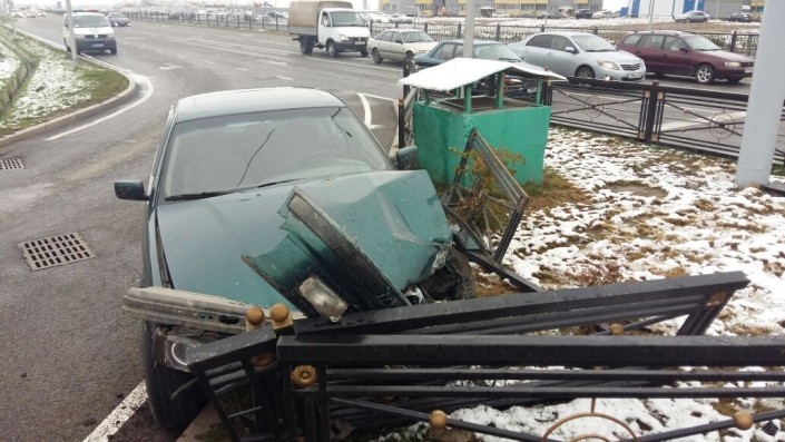Инцидент произошел днем 14 октября около 14.00 на пересечении улицы Момышулы и проспекта Рыскулова. Автомобиль BMW двигался по проспекту в восточном направлении и начал поворачивать направо на Момышулы, но водитель не справился с управлением. В результате происшествия машина снесла две секции железного ограждения на перекрестке. Отмечается, что по приезде скорой помощи был обследован водитель, в госпитализации он не нуждался.