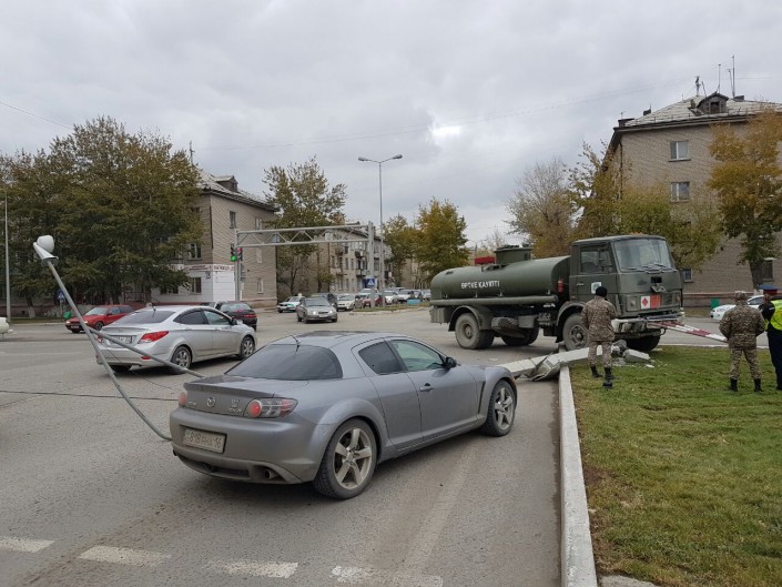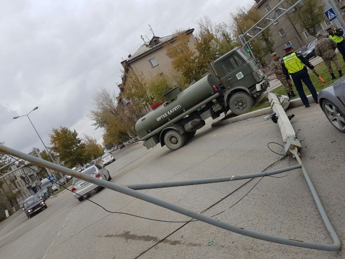 Военный грузовик сбил столб с камерой видеонаблюдения в Семее