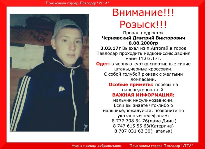 Информацию о пропаже 16-летнего Дмитрия Чернявского разместили в Instagram павлодарские волонтеры.