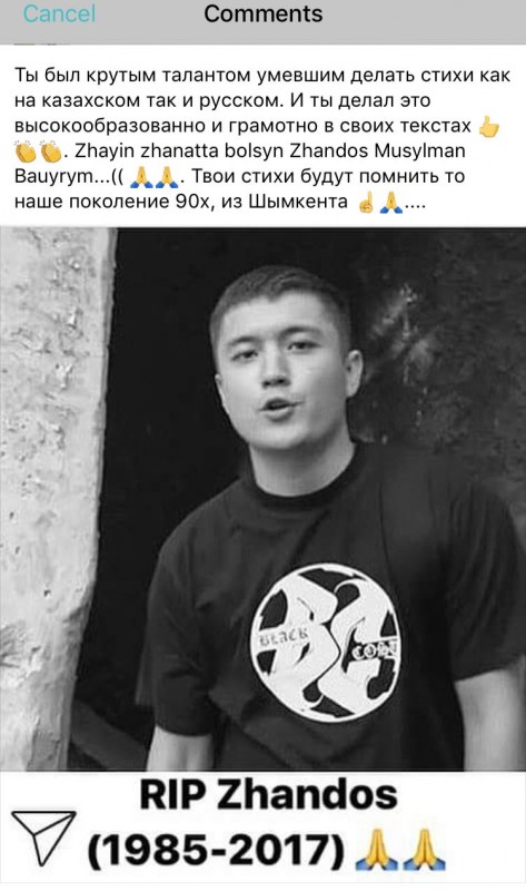 Выпавший с 15-го этажа в Алматы мужчина оказался известным в музыкальных кругах рэп-исполнителем, передает корреспондент Tengrinews.kz. В социальных сетях публикуют соболезнования семье погибшего музыканта Жандоса Талгата, известного как основателя группы Black Cost. Он выступал под псевдонимом Hazard.