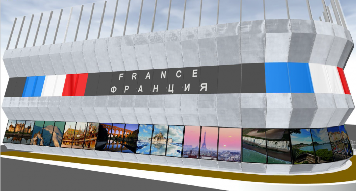 "Фасад сооружения будет украшен изображениями разных регионов Франции, с помощью которых мы хотим продемонстрировать разнообразие нашего павильона как в технологическом, так и в культурном плане. Мы хотим сыграть роль витрины, которая сможет продемонстрировать передовые достижения Франции в области "экологического перехода", - рассказал генеральный комиссар павильона Франции Паскаль Лоро.