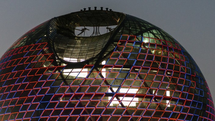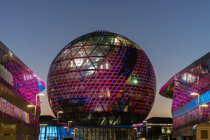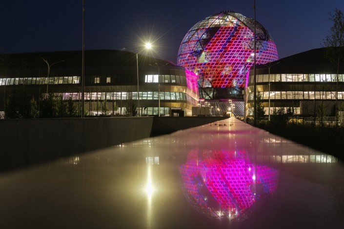 С наступлением темноты центральная сфера выглядит завораживающе. Позже, как обещают организаторы, на поверхности сферы будет демонстрироваться световое шоу.