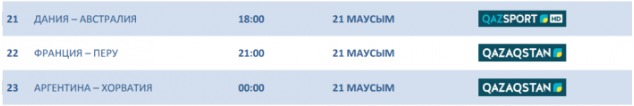 А в 00.00 в Нижнем Новгороде пройдет центральный матч дня, в котором сыграют представители группы D - сборные Аргентины и Хорватии. Данные матчи можно будет посмотреть на телеканале Qazaqstan. Онлайн-трансляция.