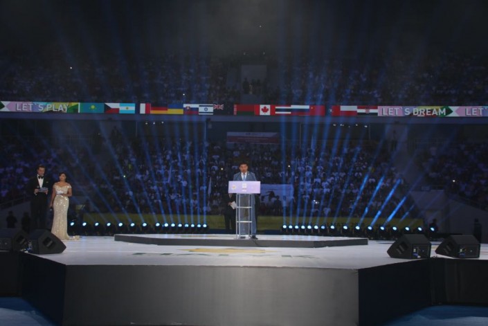 В торжественной церемонии открытия на "Алматы Арена", собравшей более 14 тысяч зрителей, приняли участие аким Алматы Бауыржан Байбек, министр образования и науки страны Ерлан Сагадиев и вице-президент ФИСУ Мариан Дымальский.